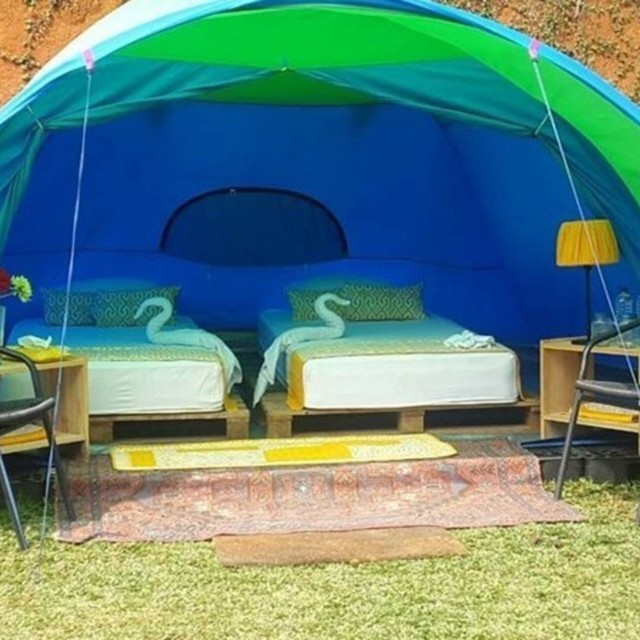 Glamorous camping (tent with AC), twin share bed (spring bed), blanket & pillow, towel, coffee maker with tea/coffee, sugar and mineral water, plug-n-play consoles, sitting toilet & hot shower, dinner with international menu & breakfast for two persons with nusantara food menu and 1x coffee break (coffee, tea & snacks)